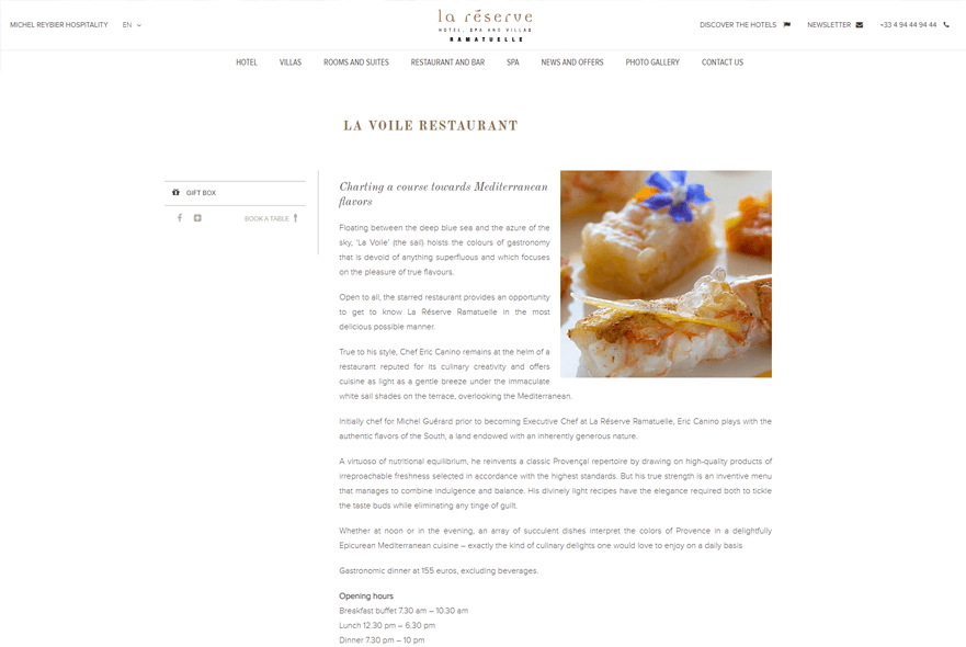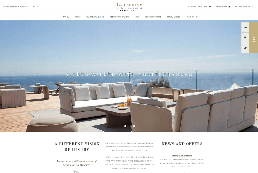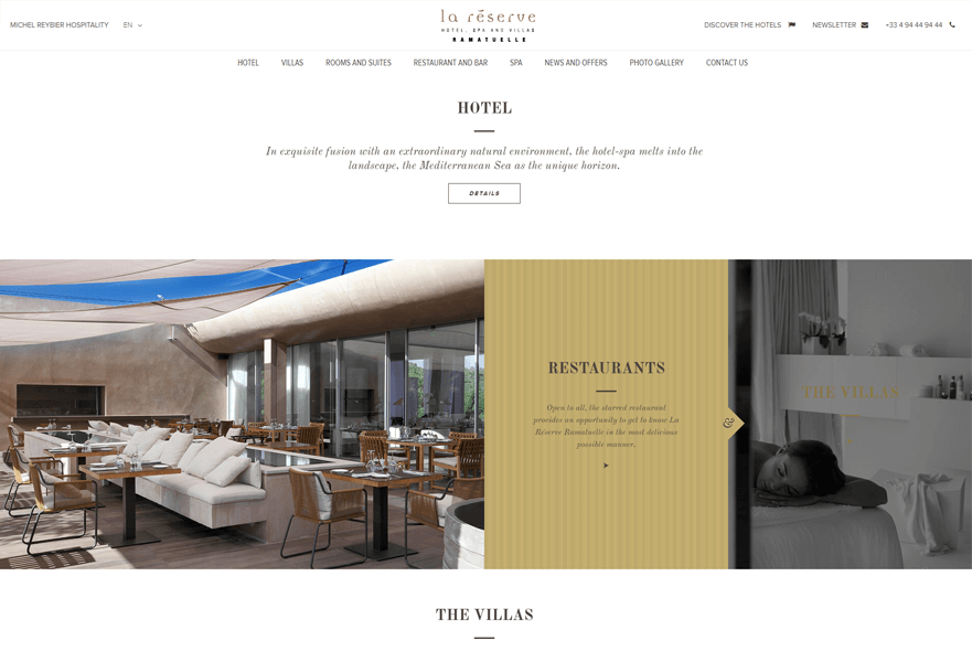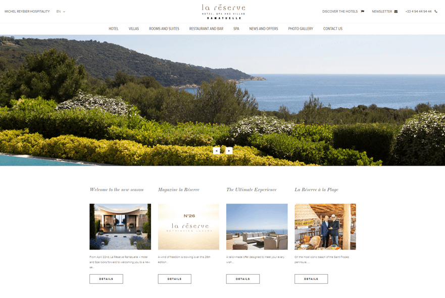 Cette solution de design classique transporte les utilisateurs dans l'univers de La Réserve Ramatuelle en respectant pleinement la vision unique de la marque et les objectifs de marketing numérique.