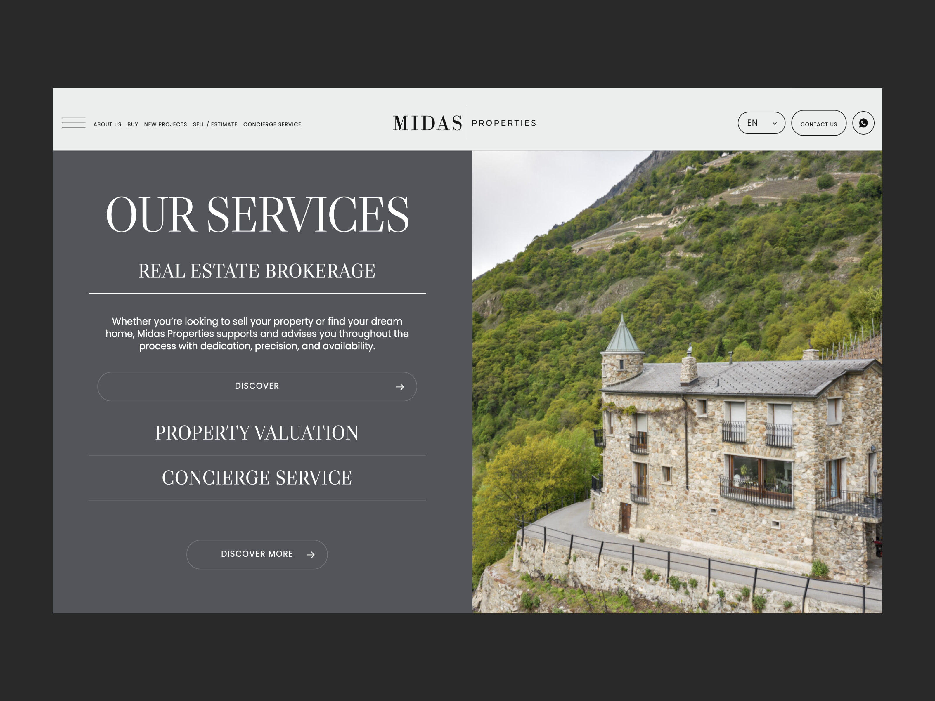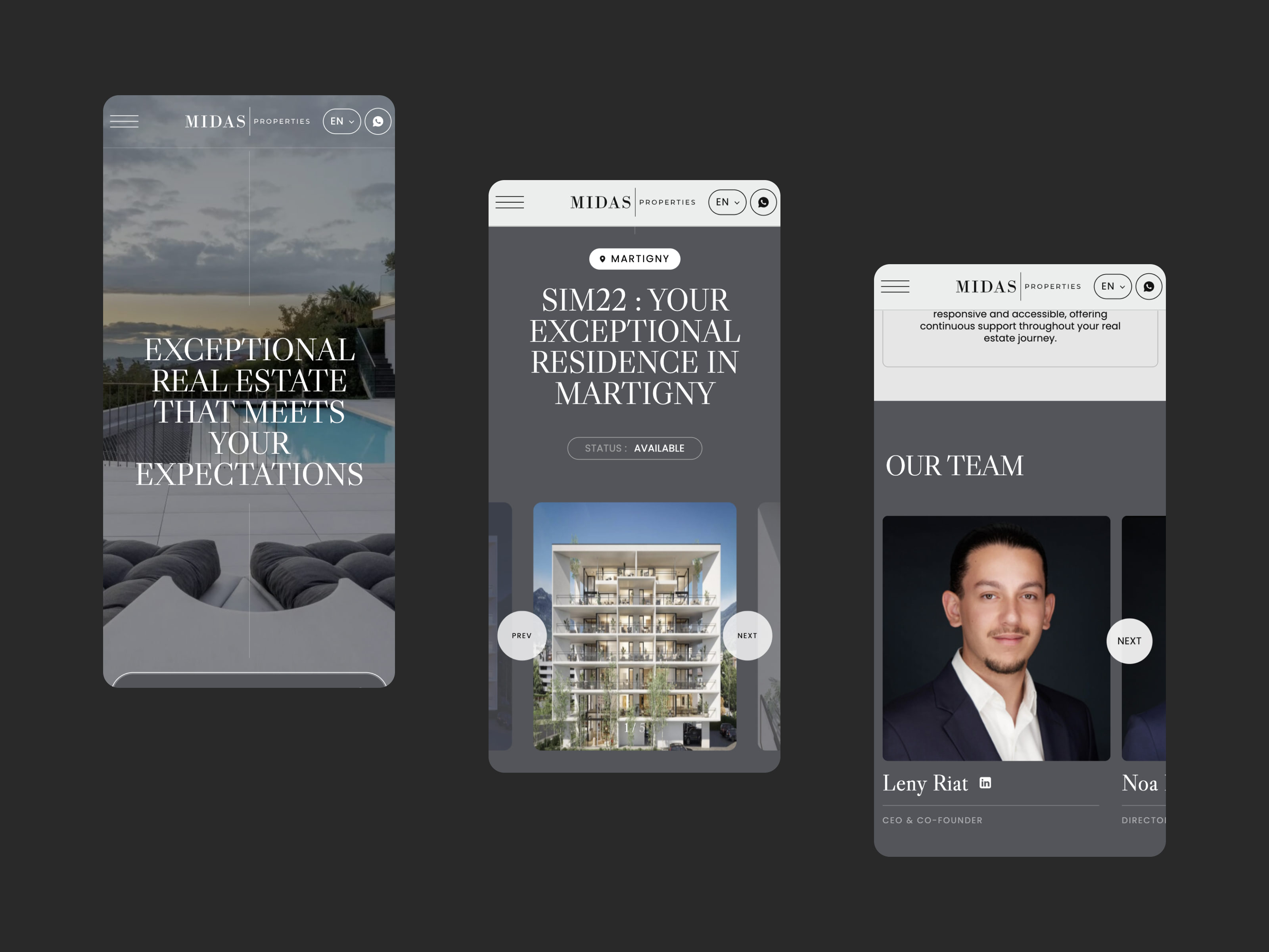 Pour répondre à ces enjeux, nous avons conçu un site sur mesure, pensé pour mettre en valeur les propriétés et refléter les valeurs de Midas Properties. Notre démarche a débuté par un atelier approfondi avec le client pour cerner ses attentes, son positionnement et les besoins de sa clientèle.